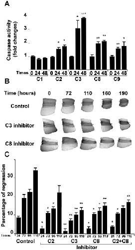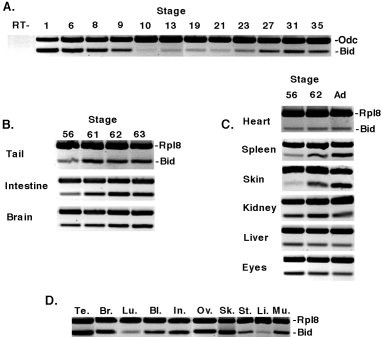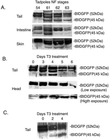 Elimination of tadpole organs during Xenopus metamorphosis is largely achieved through apoptosis, and recent evidence suggest involvement of the mitochondrial death route and bax-initiated caspase-3 and -9 deployment. However, events upstream of the activation of Bax are unknown. In other models, proteins of the BH3-only group such as BID are known to assure this function. We show that Xenopus bid transcript levels increase at metamorphosis in larval cells destined to disappear. This increase correlates with an abrupt rise in Caspase-2 and -8 mRNA levels and an enhanced activity of Caspase-2 and -8. In BIDGFP transgenic animal's tail regression is accelerated. The cleavage of BIDGFP fusion protein during natural or T(3)-induced metamorphosis was specifically inhibited by caspase-8 inhibitors. Our results show that tail regression at metamorphosis implicates an apoptotic pathway inducible by T(3) hormone in an organ autonomous manner and involving the cell death executioners BID and Caspases-2 and -8.