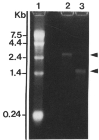 mRNAs were resolved on a denaturing agarose gel. Lane 1, RNA ladder;