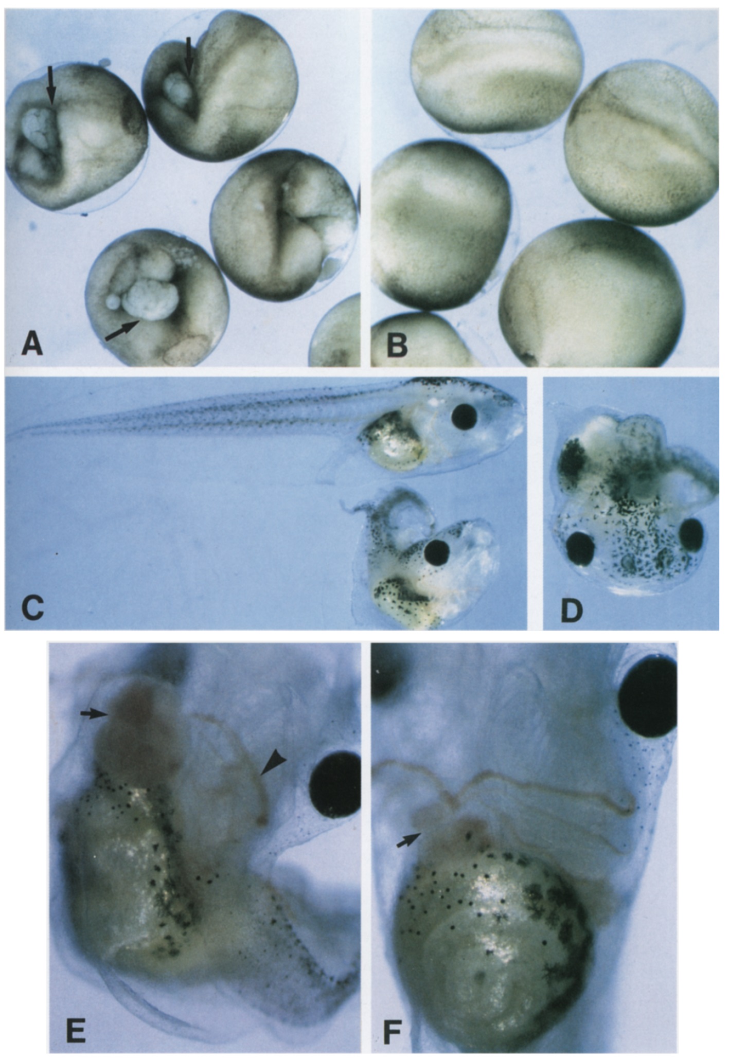 that end dorsally behind the head (arrows). (B) Control stage 20 embryos. (C) At stage 47, in comparison with a control embryo (top),