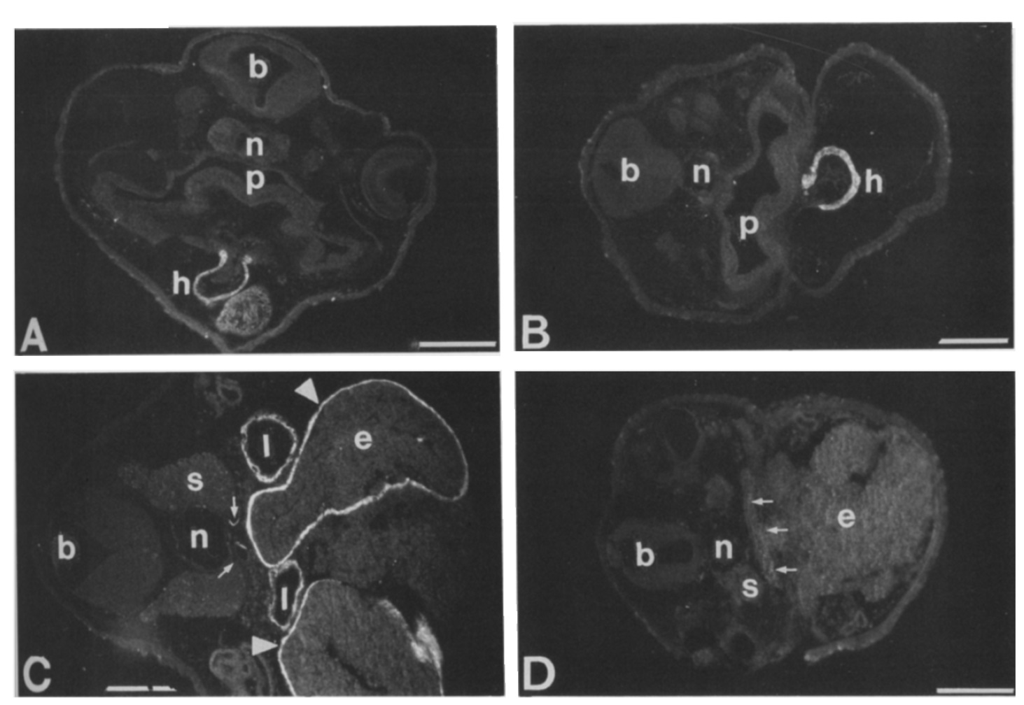 periphery of the undifferentiated endodermal mass, aorta, and the lung anlage (arrows) (D) remain devoid of any staining, b, brain; p, pharynx;