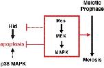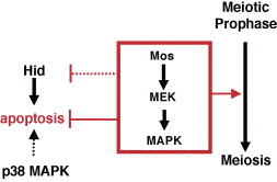 Mos/MAPK pathway as a specific regulator of germ cell death. The Mos/MAPK pathway regulates meiosis completion. MAPK family signaling in different cellular contexts has been shown to promote survival or apoptosis. In oocytes of Drosophila, starfish, and Xenopus, the Mos/MAPK pathway seems to prevent apoptosis, whereas in starfish, p38 MAPK may act to promote cell death. MAPK signaling is one of the regulatory controls that may give germ cell apoptosis some of its unique characteristics.