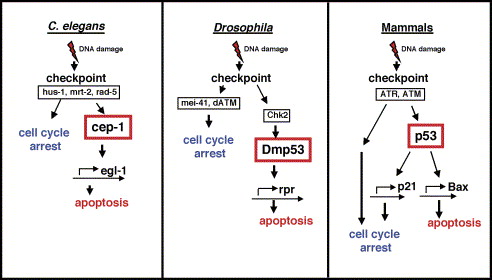 Coordination of cell cycle arrest and apoptosis. Following DNA damage, cells or embryos activate a coordinated response leading to cell cycle arrest or apoptosis. p53 is at the branching point of this decision in mammalian cells and plays an important regulatory role in both cell death and apoptosis. In contrast, p53 in invertebrates regulates only cell death and lies downstream of the decision between cell cycle arrest and cell death.