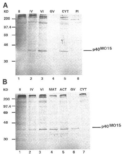 Figure 1. The synthesis and stability of p40Ml during oogenesis and meiosis. (A) Proteins from oocytes labeled for 4 h using 35Smethionine were immunoprecipitated with MO15-specific immune serum and analyzed by SDS-PAGE. The relative amounts of labeled p40Mol5 in 30 stage II (lane 1), 20 stage IV (lane 2), five stage VI (lane 3), five dissected stage VI oocyte GVs (lane 4), and five dissected stage VI oocyte cytoplasms (lane 5) are shown. Also shown is protein immunoprecipitated from five labeled stage VI oocytes using preimmune serum (lane 6). (B) Oocytes were labeled for 4 h with 35S-methionine then incubated for 16 h in excess cold methionine. In addition, a number of 35S-methionine labeled stage VI oocytes were incubated for 16 h in excess cold methionine in the presence of progesterone. Some of these progesterone-matured stage VI oocytes were then prickactivated and incubated for a further 90 min. Proteins were then immunoprecipitated and analyzed as described in A. The relative amounts of labeled p40MOl5 in 30 stage II (lane 1), 20 stage IV (lane 2), five stage VI (lane 3), five progesterone-matured stage VI oocytes (lane 4), five prick-activated, mature stage VI oocyte GVs (lane 6), and five dissected stage VI oocyte cytoplasms (lane 7) are shown. The positions of molecular weight markers (in kDa) are indicated. |