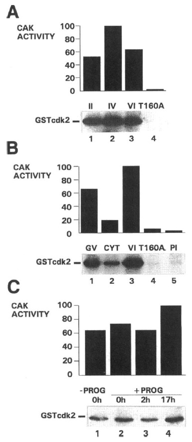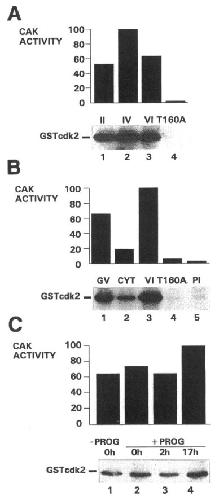 Figure 6. The activity of p4OMOI5 during oogenesis and resumption of meiosis. (A) p40Mo°5 immunoprecipitates prepared from 25 stage II oocytes (lane 1), 12.5 stage IV oocytes (lane 2), and 2.5 stage VI oocytes (lanes 3 and 4) were incubated with 1 jg of GSTcdk2 (lanes 1-3) or GSTcdk2T16OA (lane 4) and [y_-32P]ATP for 45 min at 23°C. Supematants were recovered, and phosphorylated GSTcdk2 protein was analyzed by SDS-PAGE and autoradiography (bottom). The relative amounts of 32P associated with GSTcdk2 in each reaction were subsequently quantitated by phosphorimage analysis and were plotted on an arbitrary scale of 1-100. (B) Immuno- precipitates were prepared from five dissected stage VI oocyte GVs (lane 1), five dissected stage VI cytoplasms (lane 2), and five total stage VI oocytes (lanes 3-6) using MO15-specific immune serum (lanes 1-4) or preimmune serum (lane 5). The relative amounts of CAK in each sample were assayed as described in A using 1 ,Ag of GSTcdk2 (lanes 1-3 and 5) or GSTcdk2/ T160A (lane 4). (C) p40MO15 immunoprecipitates were prepared from stage VI oocytes before (lane 1) and 0 (lane 2), 2 (lane 3), and 17 h (lane 4) after the addition of progesterone. The relative amounts of CAK in each sample were assayed as described in A using 1 ,ug of GSTcdk2. |