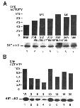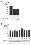 Figure 2. Steady-state levels of p40MOlS in oocytes and embryos. (A) Proteins from 25 stage II oocytes (lane 1), 12.5 stage IV oocytes (lane 2), and 2.5 stage VI oocytes were separated by SDS-PAGE and analyzed by Western blotting using M015-specific immune serum and ECL detection (bottom). The relative amounts of p40MOI5 present in each sample were quantitated by densitometry and plotted using an arbitrary scale of 1-100. (B) Proteins from five progesterone-matured stage VI oocytes (lane 1), and five stage 2, 6, 8, 10, 12, 16, 22, and 30 embryos (lanes 2-9) were separated by SDS-PAGE and analyzed by Western blotting using M015-specific immune serum and ECL detection as described in A. The relative amounts of p40MOl5 present in each sample were quantitated by densitometry and plotted using an arbitrary scale of 1-100. |