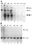 Figure 3. The relative levels of M015 mRNA in oocytes and embryos. (A) M015 cRNA (lane 1) and 10 ug of total RNA extracted from stage VI oocytes (lane 2), unfertilized eggs (lane 3), and stage 8, 10, 12, 16, and 30 embryos (lanes 4-8) were annealed to a 689-nt 32P-labeled antisense probe from the 5'-end of M015. After RNase digestion the products were analyzed on a 4% acrylamide/urea denaturing gel. Protected fragments of the predicted size of 579 nt and shorter (504 nt and 488 nt) are indicated. (B) Two micrograms of the total RNA preparations used in A from stage VI oocytes (lane 1), unfertilized eggs (lane 2), and stage 8, 10, 12, and 16 embryos (lanes 3-7) were annealed to a 454-nt 2P-labeled antisense ornithine decarboxylase RNA probe. After RNase digestion the products were analyzed on a 4% acrylamide/urea denaturing gel. The protected fragment of the predicted size of 369 nt is indicated. |
