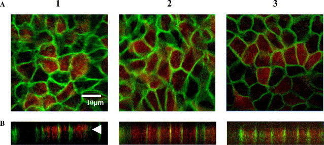 Cellular localization of NCC in the established cell lines. Localization of stably expressed NCC in MDCK II cells expressing NCC only: (1) or co-expressing NCC and wild-type WNK4 (2) or mutant WNK4 (3). XY (A) and XZ (B) images were obtained by confocal laser scanning microscopy. Immunocytochemistry was performed with rat anti-HA mAb (9Y10) and mouse anti-β catenin mAb as primary antibodies, and anti-rat IgG Alexa 546 (red) and anti-mouse IgG Alexa 488 (green) as the secondary antibodies. The arrowhead indicates the apical cell surface.