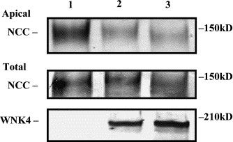 Cell surface biotinylation assay. Apical cell surface expression of NCC in MDCKII cells expressing NCC only (1) or co-expressing NCC and wild-type WNK4 (2) or mutant WNK4 (3). Stable cells expressing NCC and WNK4 were subjected to apical cell surface biotinylation assay. Biotinylated proteins were isolated with streptavidin-agarose beads and immunoblotted for NCC by anti-HA mAb (9Y10). Apical biotinylated proteins (upper panel) and the total cell lysates (middle panel) were fractioned by SDS–PAGE and immunoblotted.
