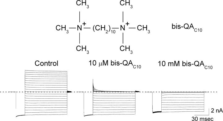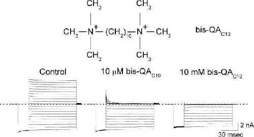 Figure 1. . Inhibition of IRK1 currents by bis-QAC10. Chemical structure of bis-QAC10 is shown on top. Current traces were recorded from a single patch in the absence (control) or presence of bis-QAC10 at the concentrations indicated. Currents were elicited by stepping membrane voltage from the 0-mV holding potential to â100 mV and then to test voltages between â100 and +100 mV in 10-mV increments before returning it to the holding potential. Dotted line indicates zero current.