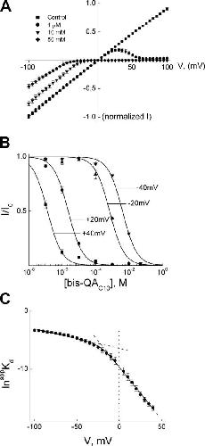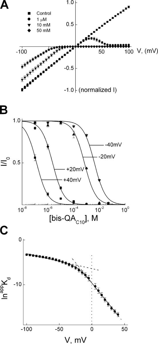 Figure 2. . Voltage dependence of steady-state IRK1 block by bis-QAC10. (A) Averaged IâV curves (mean ± SEM; n = 6) determined at the end of test pulses in the absence (control) or presence of various concentrations of bis-QA C10. (B) The fraction of current not blocked is plotted against bis-QA C10 concentration at the four representative voltages indicated. Curves through the data represent the equation I/Io = appKd/(appKd + [bis-QAC10]). (C) The natural logarithm of appKd is plotted against membrane voltage. The line through the data is a fit of Eq. 1a, yielding K1 = 3.10 ± 0.11 Ã10â3 M (mean ± SEM; n = 6), K2 = 3.04 ± 0.72 à 10â2, Z1 = 0.82 ± 0.03, and Z2 = 3.63 ± 0.20, where the overall appKd (0 mV) = K1K2. The dashed lines indicate the limiting slopes, and the vertical dotted line indicates zero voltage.