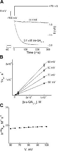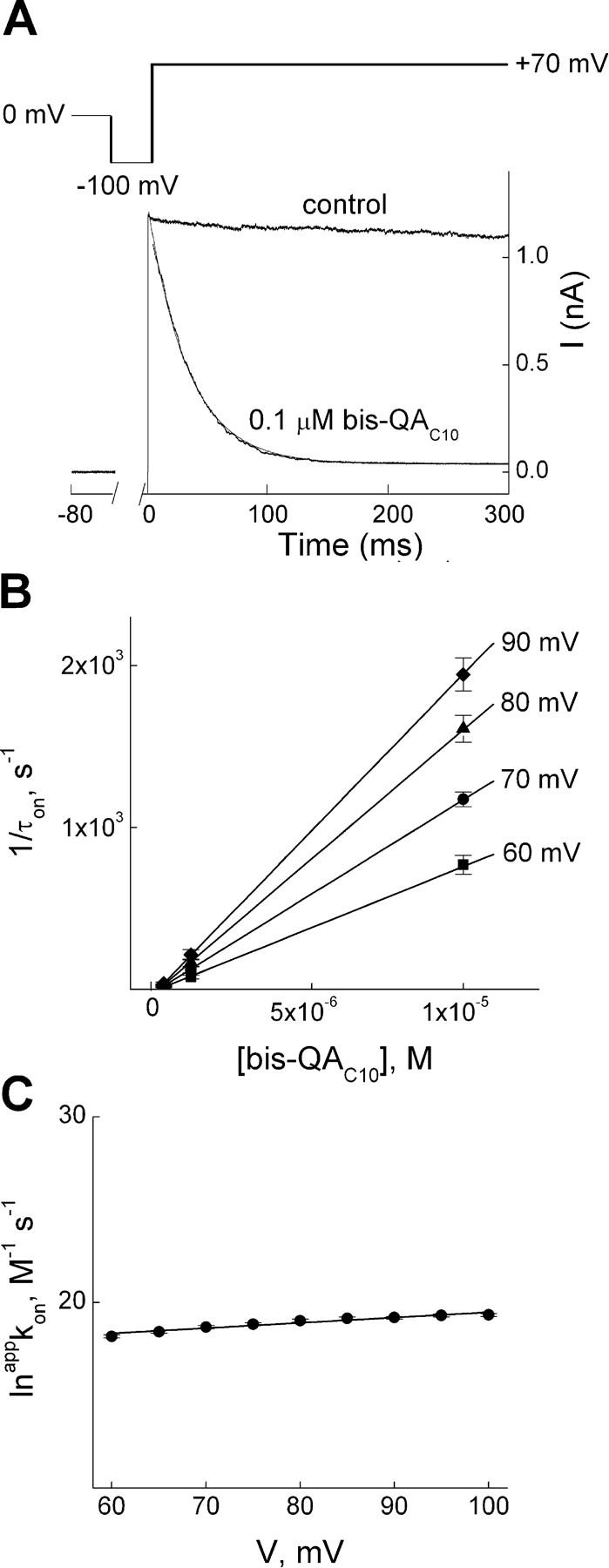 Figure 3. . Kinetics of depolarization-induced IRK1 block by bis-QAC10. (A) Current transient elicited by stepping membrane voltage from â100 to 70 mV in the absence (control) or presence of 0.1 μM bis-QAC10; the first 3 ms of the transient in the presence of bis-QAC10 was omitted (see results). The curve superimposed on the transient (and back extrapolated to the start of depolarization) is a single-exponential fit. (B) The reciprocal of the time constant (mean ± SEM, n = 6) for channel block (1/Ïon), obtained as shown in A, is plotted against bis-QAC10 concentration (0.1, 1, and 10 μM) for four voltages. The lines through the data are linear fits whose slope gives the apparent second-order rate constant (appkon) for blocker binding. (C) The natural logarithm of appkon from B is plotted against membrane voltage. The line through the data is a fit of the Boltzmann function, yielding kon(0 mV) = 1.63 ± 0.37 à 107 Mâ1sâ1 (mean ± SEM, n = 6) and zon = 0.73 ± 0.07.