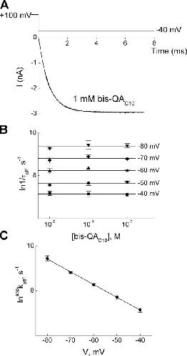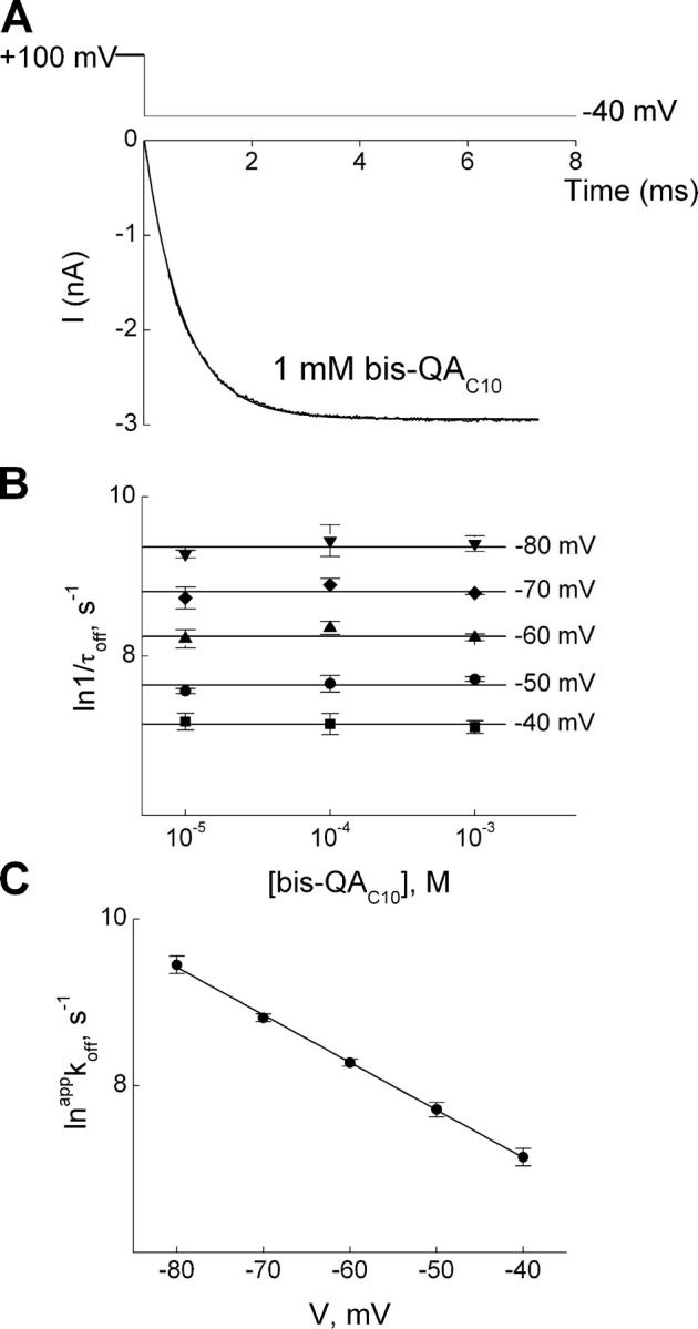 Figure 4. . Kinetics of hyperpolarization-induced unblock of IRK1 channels in the presence of bis-QAC10. (A) Current transient elicited by stepping membrane voltage from 100 to â40 mV in the presence of 1 mM bis-QAC10, where the first 0.3 ms of the trace was omitted. The curve superimposed on the transient (and back extrapolated to the start of depolarization) is a single-exponential fit. (B) The natural logarithm of the reciprocal of the time constants (mean ± SEM; n = 3) for channel unblock (1/Ïoff, an estimate of the apparent off rate constant appkoff), obtained as shown in A, is plotted against bis-QAC10 concentration for five voltages. The lines through the data represent, for a given voltage, the average over the three concentrations tested. (C) The natural logarithm of the average appkoff from B is plotted against membrane voltage. The line through the data is a fit of the Boltzmann function, yielding koff(0 mV) = 1.06 ± 0.07 à 102 sâ1 (mean ± SEM, n = 3) and zoff = 1.46 ± 0.02.