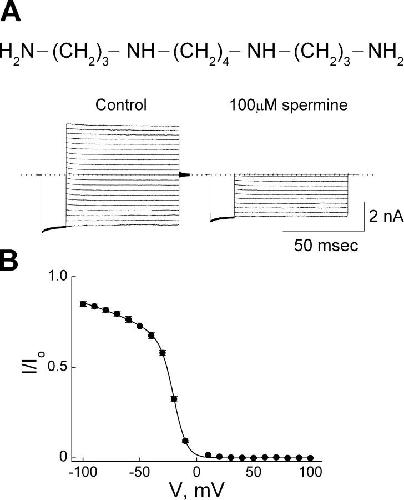 Figure 6. . Voltage dependence of steady-state IRK1 block by spermine. (A) Chemical structure of spermine is shown on top. IRK1 currents recorded from a single patch in the absence (control) then presence of 100 μM spermine were elicited with the same voltage protocol as in Fig. 1. Dotted line indicates zero current. (B) The fraction of current (mean ± SEM, n = 9) not blocked by 100 μM spermine is plotted against membrane voltage. The curve through the data is a fit of Eq. 1, yielding K1 = 1.30 ± 0.06 × 10−4 M (mean ± SEM, n = 9), K2 = 1.44 ± 0.13 × 10−2, Z1 = 0.40 ± 0.02, and Z2 = 4.23 ± 0.13, where the overall appKd (0 mV) = K1K2.