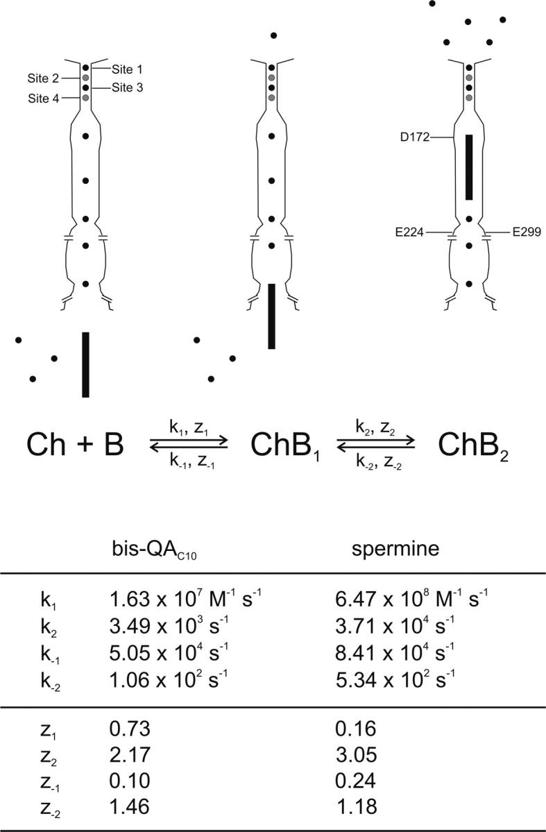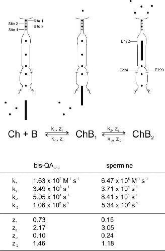 Figure 9. . Kinetic model for spermine or bis-QAC10 block of the IRK1 channel. Binding of a blocker (B) to a channel (Ch) produces two sequentially related blocked states (ChB1 and ChB2). Top, cartoon representing the three channel states (see also Guo et al., 2003; Guo and Lu, 2003; Lu, 2004). The position of K+ ions (maximally totaling five) in the inner pore is arbitrary. The rate constants (kx) and associated valences (zx) for each blocker are tabulated below.