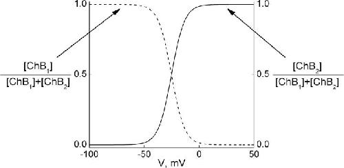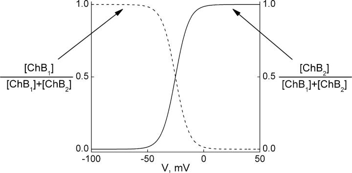 Figure 10. . Distribution of the two blocked states of the model in Fig. 9 as a function of voltage. The relative distributions of the first (dashed curve) and second (solid curve) blocked states, computed using Eq. 2 and the parameters K2 (=[ChB1]/[ChB2]) = 1.44 × 10−2 and Z2 = 4.23 obtained from a fit of Eq. 1 to the data of Fig. 6 B, are plotted against membrane voltage.