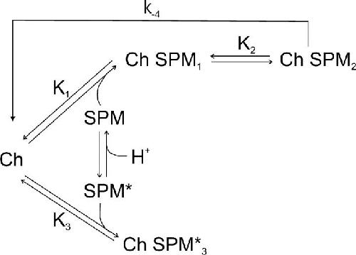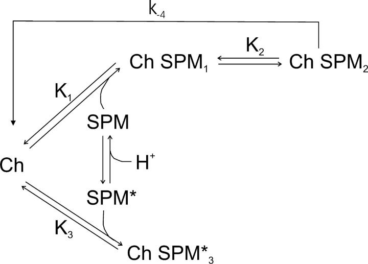 Figure 11. . Expanded version of model in Fig. 9 where the blocker spermine exists in two protonation forms. In the more protonated (more charged) form spermine (SPM) traverses the pore at a low rate (k−4 ∼ 10 s−1). K3 (∼10−5 M) is the equilibrium dissociation constant for binding of the less protonated (non or much less permeating) form of spermine (SPM*) to the channel (Kb1 in Guo and Lu, 2000b). Values of rate constants and valences for other transitions are as in Fig. 9.