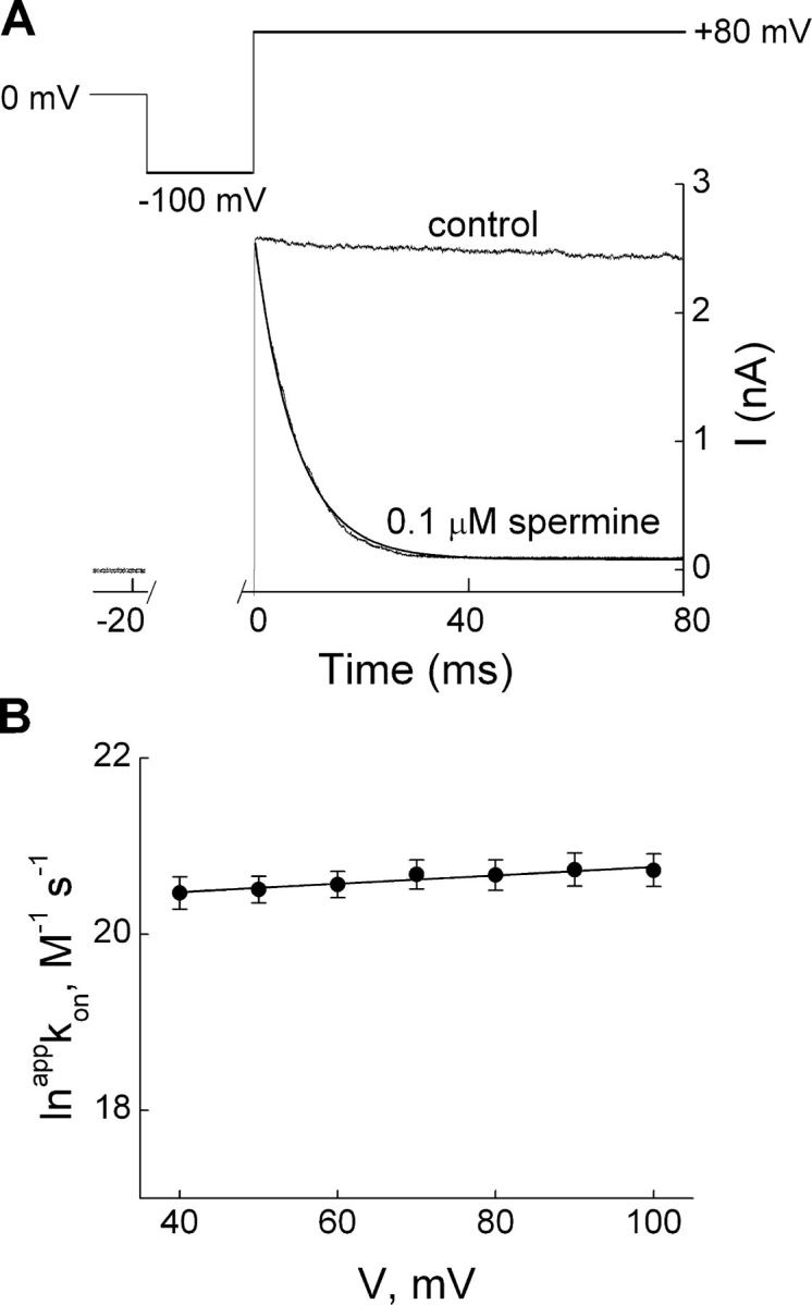 Figure 7. . Kinetics of depolarization-induced IRK1 block by spermine. (A) Current transient elicited by stepping membrane voltage from −100 to 80 mV in the absence (control) or presence of 0.1 μM spermine, where the first 3 ms of the record in the presence of spermine was omitted, and the curve superimposed on the transient is a single-exponential fit. (B) The natural logarithm of appkon, obtained with the method shown in Fig. 3, B and C, from data such as shown in A, is plotted against membrane voltage. The line through the data is a fit of the Boltzmann function, yielding kon(0 mV) = 6.47 ± 0.30 × 108 M−1s−1 (mean ± SEM, n = 23) and zon = 0.16 ± 0.02.