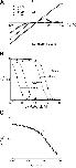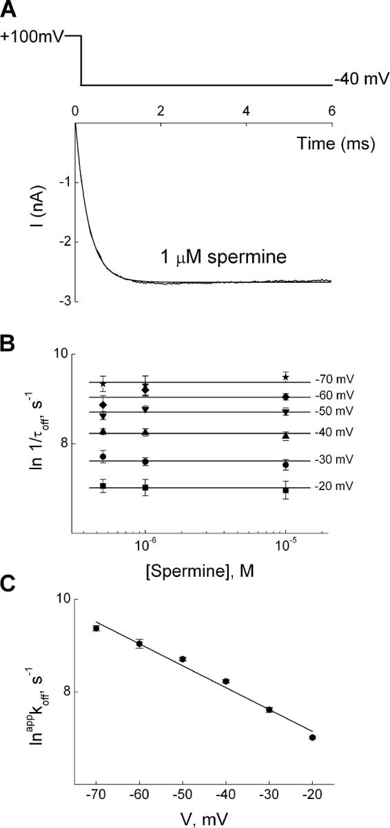 Figure 8. . Kinetics of hyperpolarization-induced unblock of IRK1 channels in the presence of spermine. (A) Current transient elicited by stepping membrane voltage from 100 to −40 mV in the presence of 1 μM spermine, where the first 0.3 ms of the trace was omitted. The curve superimposed on the transient is a single-exponential fit. (B) The natural logarithm of the reciprocal of the time constants (mean ± SEM; n = 6) for channel unblock (1/τoff, an estimate of the apparent rate constant appkoff), obtained as shown in A, is plotted against spermine concentration for six voltages. The lines through the data represent, for a given voltage, the average over the three concentrations tested. (C) The natural logarithm of average appkoff from B is plotted against membrane voltage. The line through the data is a fit of the Boltzmann function, yielding koff(0 mV) = 5.34 ± 0.80 × 102 s−1 (mean ± SEM, n = 6) and zoff = 1.18 ± 0.08.