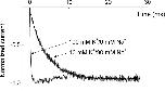 Figure 5. . Extracellular K+ sensitivity of hyperpolarization-induced unblock kinetics in the presence of bis-QAC10. Normalized current transients elicited by stepping membrane voltage from 100 to â70 mV in the presence of 0.1 mM bis-QAC10 and either 100 or 10 mM extracellular K+, where the first 0.1 or 0.3 ms of the record was omitted. The 10 mM K+ extracellular solution contained 90 mM Na+; the intracellular solution contained 100 mM K+ in both cases. The curves superimposed on the current transients are single-exponential fits. From these and similar fits, we obtained time constants of 0.15 ± 0.02 and 4.59 ± 0.27 ms (mean ± SEM; n = 3 and 4) for 100 and 10 mM extracellular K+, respectively.