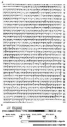 amino acids are not indicated. (B) Diagram showing the homologies (similar/identical amino acids) in different domains of XLEg5Kl and
