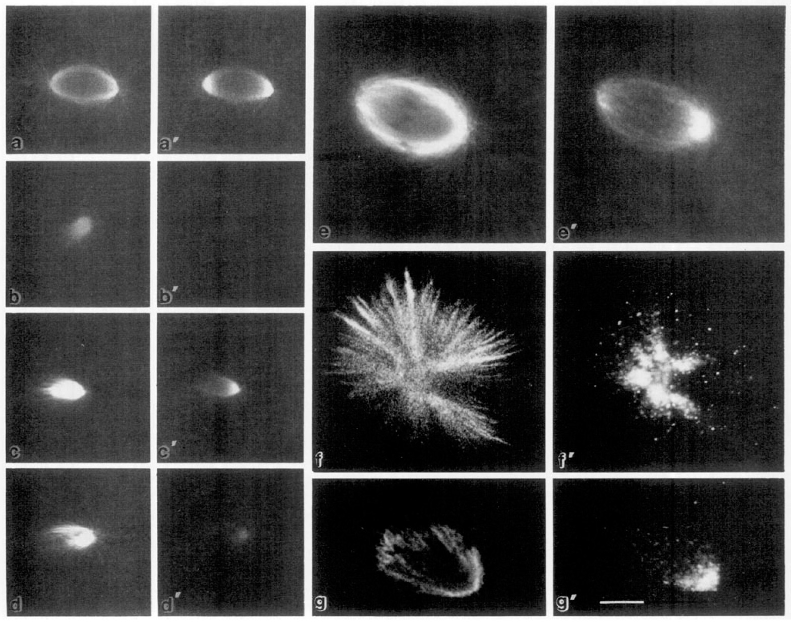 affinity-purified anti-tail antibody. (a-e) Metaphase II spindles from unfertilized eggs; (f) a monaster found during spindle formation; and (g) a
