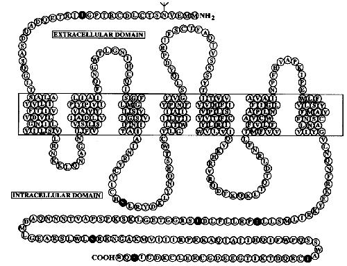FiG. 5. Proposed membrane structure of the Xenopus melatonin receptor. Deduced amino acid sequence is shown. Yt, Potential N-linked