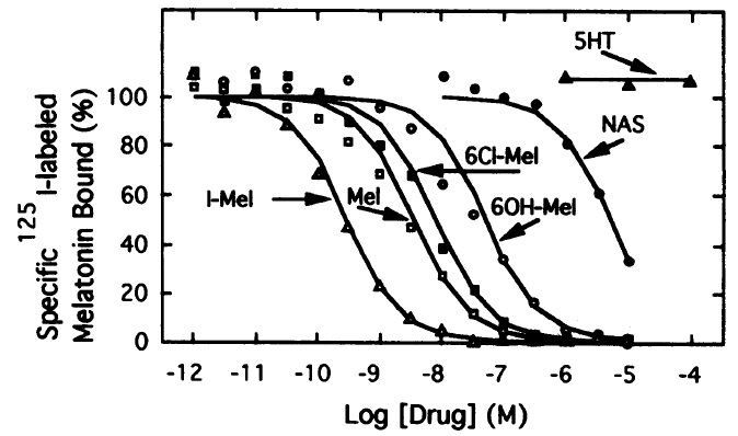 FIG. 2. Competition by various ligands for 125I-Mel binding in