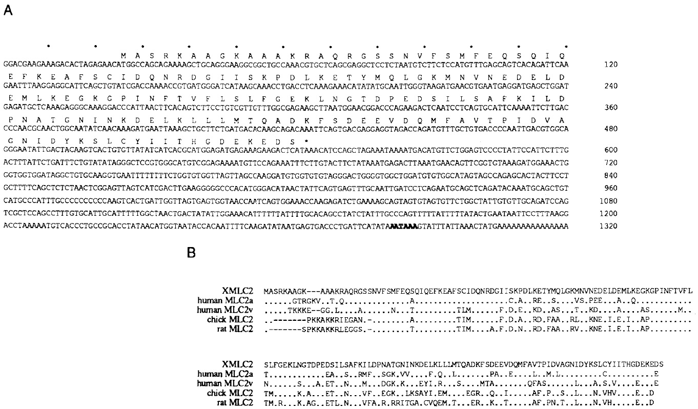 addition sequence (bold). (B) Comparison of XMLC2 and other vertebrate MLC2 proteins. The XMLC2 polypeptide sequence is aligned with the human atrial (Hailstones et al.