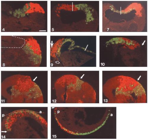 Fig. 14. At stage 12.5, the A1 clone (green) has reached the blastopore lip (arrow) and contributes extensively to the entire neural ectoderm.