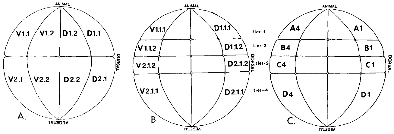 labeled with the nomenclature of Jacobson and Hirose (1981). (C) 32-cell embryo labeled with the nomenclature of Nakamura and Kishiyama