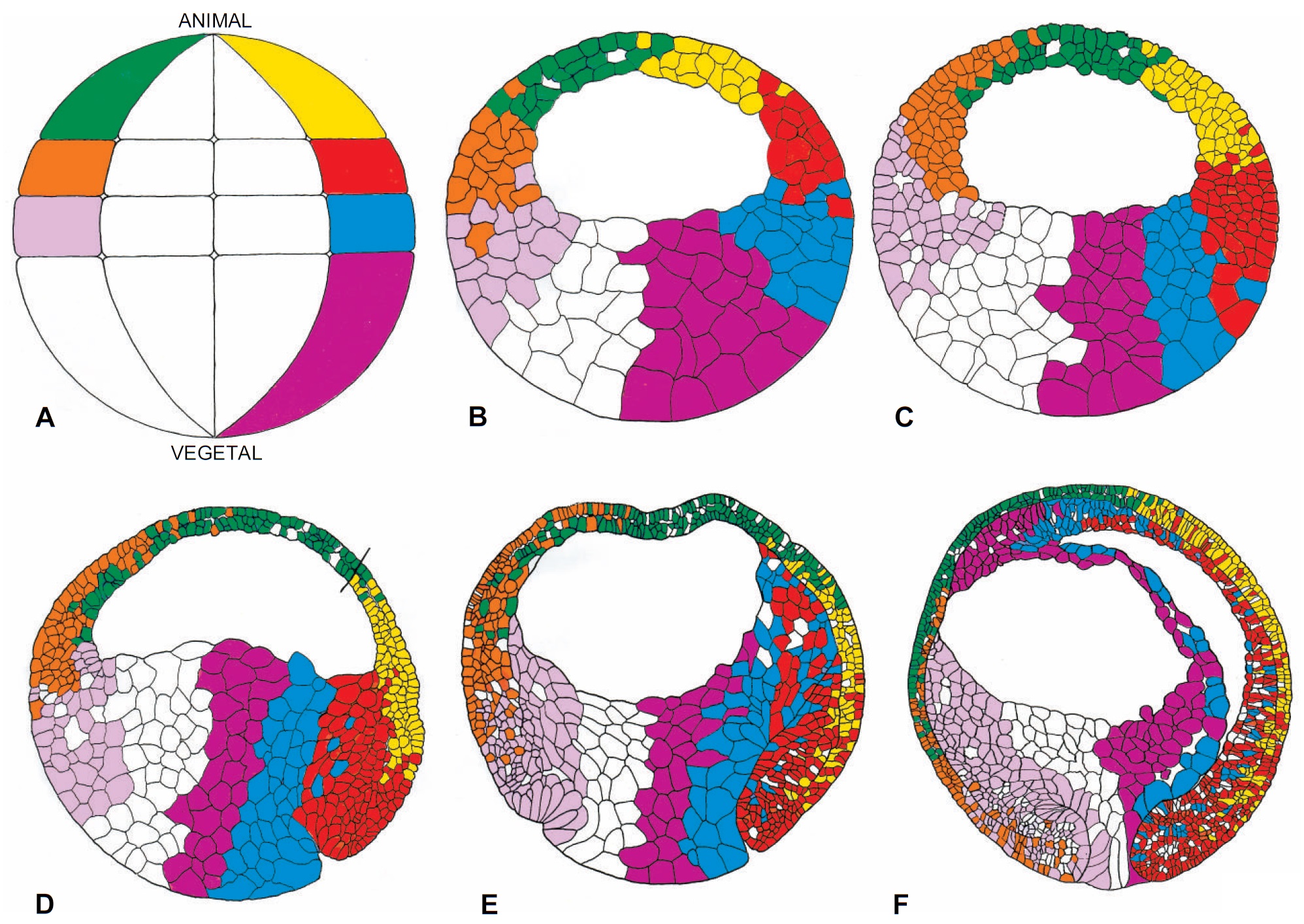 blastomere clones were labeled with different lineage dyes. These illustrations are