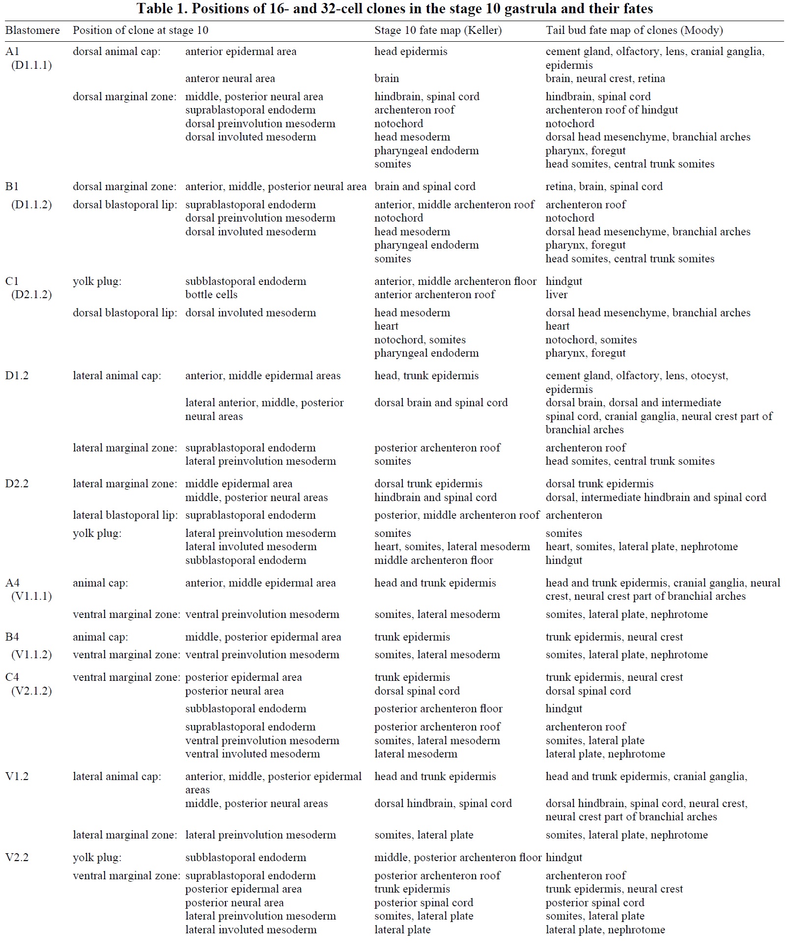 Table 1. Positions of 16- and 32-cell clones in the stage 10 gastrula and their fates