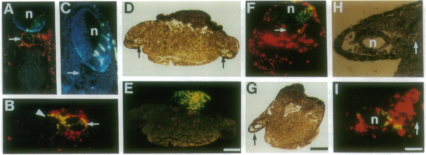 (arrowhead) contains Bi-derived cells. Blue staining in the ventolateral aspects of the neural tube (A; also in C) corresponds to immunostaining
