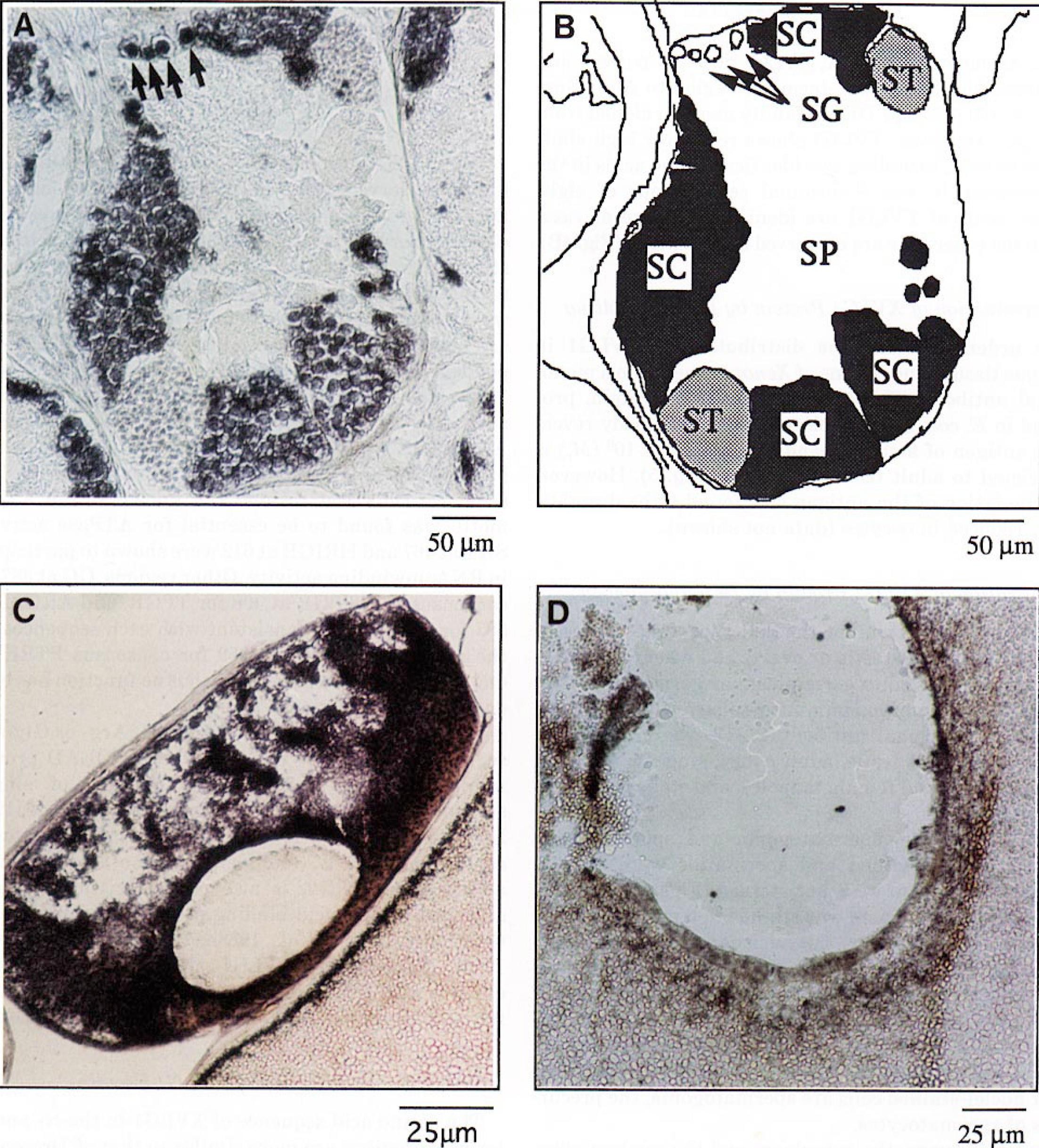 indicated as bars under each figure. (A) A section of the seminiferous tubules of the testis. Spermatocytes (SC) are strongly stained and