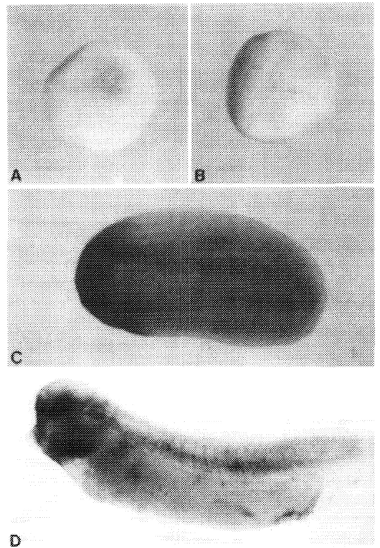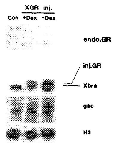 We have studied the spatial expression of the Xenopus GR in early embryos by whole-mount in situ hybridization. At the gastrula stage, GR mRNA is localized in the dorsal ectoderm. By the early neurula stage, GR transcripts were detected along the notoplate. Between mid and late neurula stages, GR mRNA was not detectable. At the tailbud stage, GR mRNA was found in the anterior part of the embryo, including the cement gland, eyes, brain, the foregut, stomodeal-hypophyseal anlage, the olfactory placodes, head mesenchyme and somites. Injection of Xenopus GR RNA into zygotes followed by treatment dexamethasone from the blastula stage onwards inhibits early differentiation. Expression of Xbra, gsc and histone H3 genes in these embryos is not inhibited, indicating that the GR effects are not due to a general squelching effect on transcription.