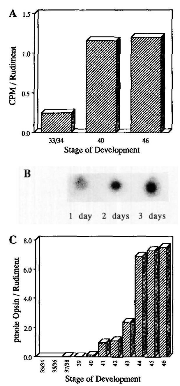Opsin can first be detected at stage 37/ 38 and the level of accumulation