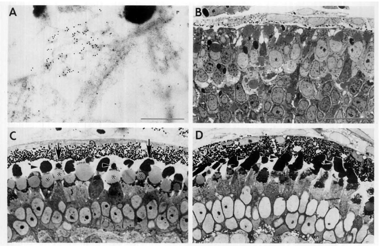 PE. Most outer segments are immunolabeled (arrows). However, some membranous material is unlabeled (arrowheads) indicating that it could