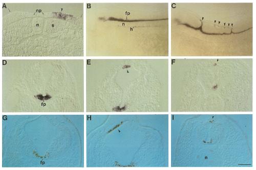 The differentiation of distinct cell types in the ventral neural tube depends on local inductive signals from the notochord. We have isolated a vertebrate homolog of the Drosophila segment polarity gene hedgehog (hh) from zebrafish and rat, termed vhh-1. vhh-1 is expressed in the node, notochord, floor plate, and posterior limb bud mesenchyme. Each of these cell groups has floor plate inducing activity, suggesting that the vhh-1 gene may encode a floor plate-inducing molecule. Widespread expression of rat vhh-1 in frog embryos leads to ectopic floor plate differentiation in the neural tube. In vitro tests for the signaling functions of vhh-1 demonstrate that COS cells expressing the rat vhh-1 gene induce floor plate and motor neuron differentiation in neural plate explants. vhh-1 may, therefore, contribute to the floor plate and motor neuron inducing activities of the notochord.