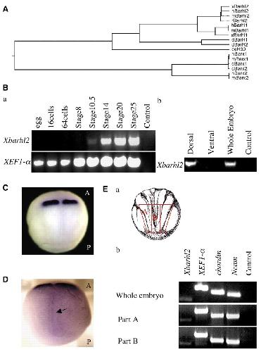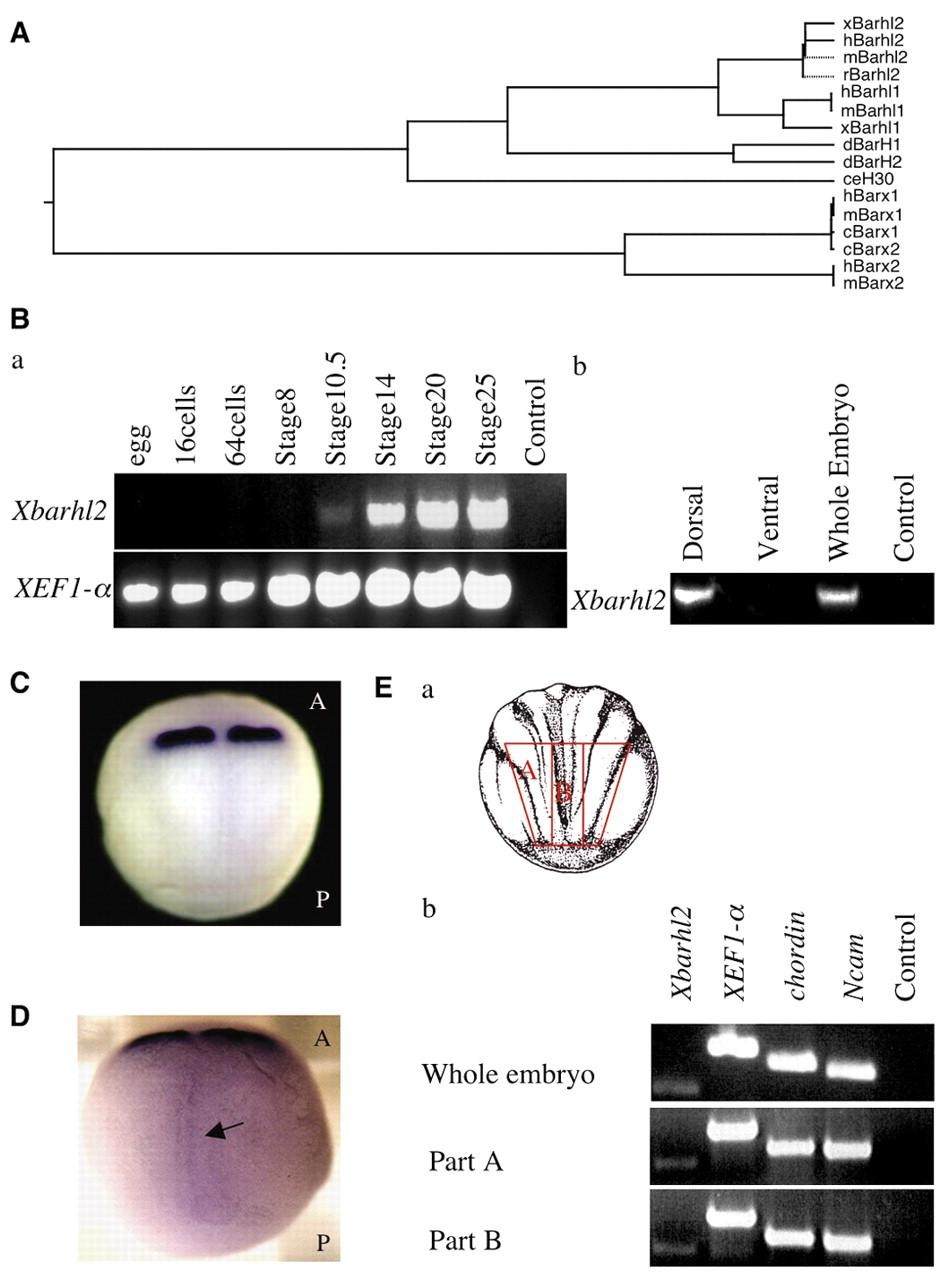 Fig. 1. Phylogenetic analysis and early expression pattern of XBarhl2. (A) Phylogenetic tree based on identity in 60 amino acid homeobox region between the Barhl proteins in human, mouse, rat, Xenopus, C. elegans and Drosophila and the Barx proteins of human and chicken (Barlow and Francis-West, 1997; Edelman et al., 2000; Hjalt and Murray, 1999). Mouse Barhl2 (Mo et al., 2004), mouse Barhl1 (Bulfone et al., 2000; Li et al., 2002) and XBarhl2 (Patterson et al., 2000; Poggi et al., 2004) sequences were determined by us. Human Barhl2 (GenBank AL355867) and human Barhl1 (GenBank AL354735) sequences were predicted from their genomic DNA sequences; rat Barhl2 (MBH1) (Saba et al., 2003; Saito et al., 1998). The tree was determined using MegAlign from the Lasergene Navigator, licensed by DNAStar. d, Drosophila melanogaster; m, Mus musculus; r, Rattus norvegicus; x, Xenopus laevis; d-rer, Dario rerio; ce, Caenorhabditis elegans; h, Homo sapiens. (B) Expression of Xbarhl2 as determined by RT-PCR analysis on embryos at different embryonic stages and dissected parts of embryos. (a) Xbarhl2 starts to be expressed at stage 10.5. XEF-1α was analyzed as a control. (b) At stage 10.5 Xbarhl2 is expressed in the dorsal part of the embryo. (C,D) Whole-mount in situ hybridization of embryos, using Xbarhl2 as a probe. (C) Dorsal view of stage 14 embryos showing expression of Xbarhl2 in the dorsal diencephalon. (D) Same embryo as C rotated showing expression along the midline (arrow). A, anterior; P, posterior. (E) RT-PCR analysis. (a) Drawing of a stage 14 embryo showing dissected parts (Nieuwkoop and Faber, 1967). (b) Xbarhl2 is expressed in the posterior neural plate, posterior dorsal mesoderm and in the midline of stage 14 embryo. Chordin and Ncam were analyzed as mesodermal and neuroectodermal markers, respectively. |