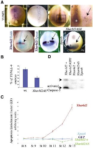 Fig. 4. Barhl2 pro-apoptotic activity is normally involved in regulating endogenous apoptosis. (A) TUNEL staining of stage 12.5 (a), stage 15 (b) and stage 18 (c,d) embryos. (d) Magnified view of the boxed region in c. (e,f) Double in situ hybridization of stage 18 embryos using digoxigenin- and fluorescein-labeled RNA probes: Xbarhl2 (dark blue) and Xshh (light blue) (e); Xbarhl2 (dark blue) and Xpax6 (light blue) (f). (g) In situ hybridization of Xbarhl2AS-injected embryo using Xpax6 as a probe. (a,b) Dorsal views, anterior upwards. (c-f) Anterior views, dorsal upwards. (B) Comparison of the percentage of TUNEL-positive embryos (defined as exhibiting more then 30 apoptotic nuclei in the axial midline, i.e. where endogenous apoptosis normally occurs) between wild-type embryos and embryos injected in the two dorsal blastomeres at the two-cell stage with Xbarhl2AS. Each experimental batch (n=60) was assessed independently. Three different experiments were performed and the results are shown as mean±s.e.m. (C) Kinetics of Xbarhl2 induced apoptosis between stage 8 and stage 13. Embryos were injected in one dorsal blastomere at the two-cell stage with GFP (dark blue), Xbarhl2 (red), Xbarhl2 together with Xbarhl2AS (green) or Xpax6 (light blue) and collected at indicated developmental stages. Cell death was measured by cell death detection ELISA. The apoptotic EF is calculated using GFP-injected embryos as a control. We carried out three different experiments and the results are shown as mean±s.e.m. (D) Western blot analysis on 3 μg of protein extracted from stage 12 embryos injected with Xbarhl2 (100 pg) together with Xbarhl2ASIII or Xbarhl2 (100 pg) together with Xbarhl2ASII, Xpax6 (100 pg), as indicated. The arrow indicates the large (19 kDa) cleaved caspase 3 fragment. The broken arrow shows a nonspecific band used as an internal control. |