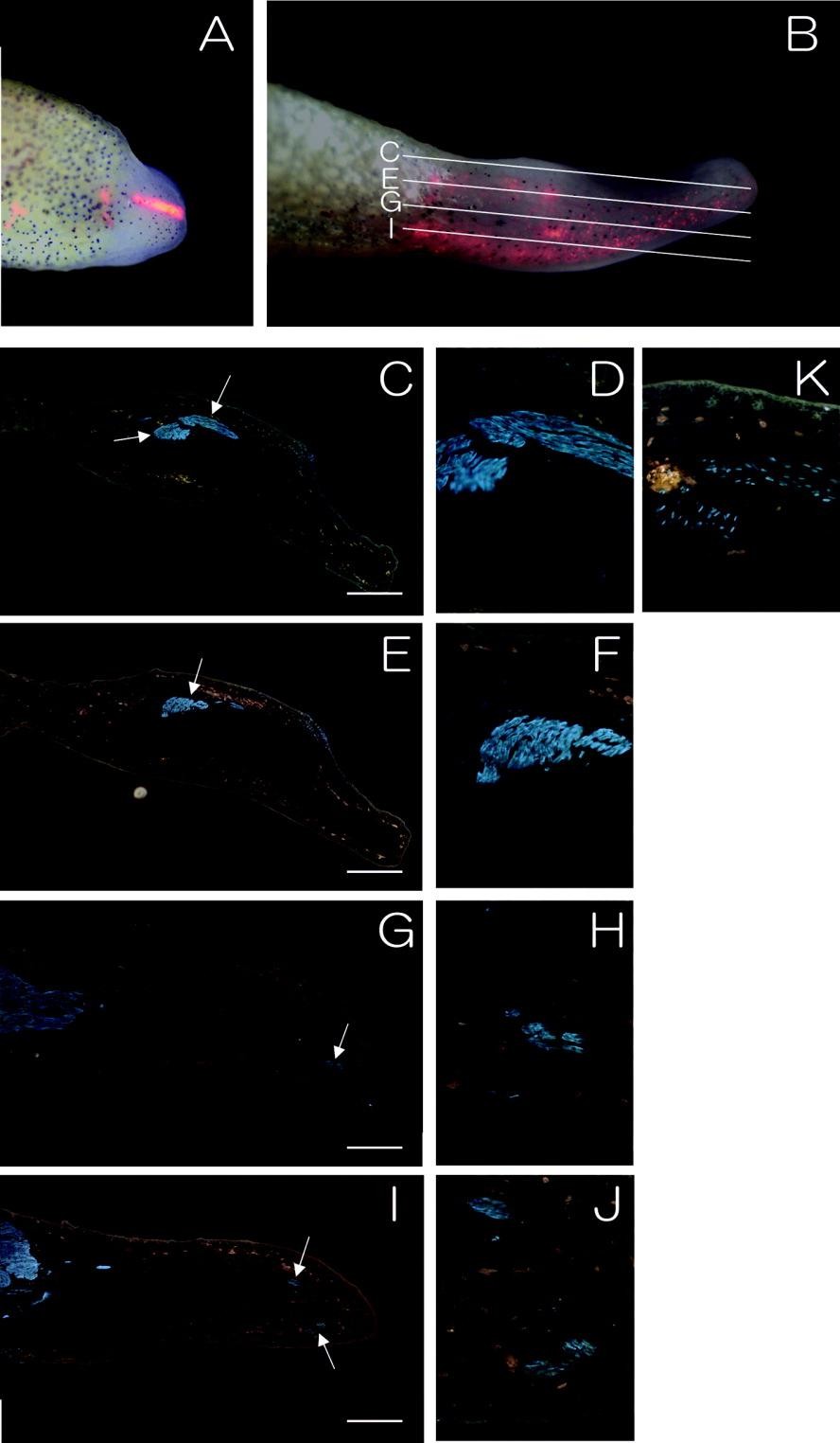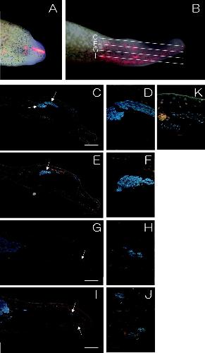 Figure 5. P14 cells stimulate muscle formation in the froglet blastema. A,B: Hepatocyte growth factor (HGF) -releasing P14 cells labeled with red fluorescent dye PKH26 were implanted into the froglet blastema (A), and after 2 weeks, implanted P14 cells were detected in the froglet blastema (B). C-J: An anterior-posterior series of sections made from a specimen shown in B was stained with MF20 antibody. Arrows indicate that clusters of differentiated muscle cells existed in the manipulated spike, and higher magnifications of the regions indicated by the arrows are shown in D,F,H,J. These well-organized muscle fibers seem to consist of the bundled multinucleate fibers. K: Immunostaining with anti-Pax7 antibodies shows Pax7-expressing cells detectable at the MF20-positive region. Scale bars = 400 mu m.