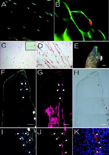 Figure 4. Froglet blastema has a permissive environment for survival and differentiation of muscle precursor cells. A,B:Xenopus limbmuscletissue in the adult frog possesses Pax7-positive cells (A, fluorescein isothiocyanate [FITC] in blueâgreen); a transverse section of the muscletissue was stained with anti-laminin (FITC in green) and anti-Pax7 (rhodamine in red) antibodies, and a high magnification of a section shows that a Pax7-positive in red is located inside basal laminae visualized by anti-laminin immunoreactivity in green (B). CâK: Cells isolated from muscletissue of froglet femora were cultured for 1 day and stained with anti-Pax7 antibody. C: In low cell density, many cultured cells were Pax7-positive (C, insert, diaminobenzidine staining in brown). D: After 10 days incubation, a lot of elongated multinucleate cells were MF20-positive. E: An overlap image of bright and fluorescent field embosses implanted cell aggregates that contain 1 day-cultured Pax7-positive cells from cmvâgreen fluorescent protein (GFP) transgenic frogs. FâJ: After 14â21 days, samples were stained with anti-GFP (F,I) and MF20 (G,J) antibody; a brightfield view (H). F,I: GFP-positive cells were recognizable in the blastema (arrows and arrowheads). F,G,I,J: Some GFP-positive cells were MF20-positive (arrowheads), and other ones were MF20-negative (arrows). K: The 4â²,6-diamidine-2-phenylidole-dihydrochloride (DAPI) staining (blue) shows that some of these double-positive cells are multinucleate (arrowheads). Scale bars = 400 μm.