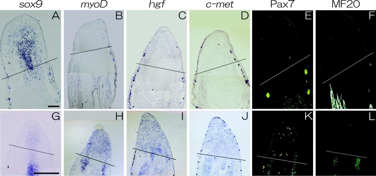 Figure 2. Myogenic marker gene expressions in the regenerating blastema. A-F: Sections of the froglet blastema that developed for 14 days after amputation. G-L: Sections of the tadpoleblastema at 5 days after amputation. A,G: Sox9 transcripts were found in the middle of the blastema. B,H: Slight myoD expression was observed only in the stump region (H) and not within the froglet blastema (B). MyoD is expressed both in the tadpoleblastema and stump region (H). C,D,I,J: Faint expressions of hgf (C)and c-met (D) were detectable in the froglet blastema, and in the tadpoleblastema, significant signals for both hgf (I) and c-met (J) were detected. E,F,K,L: Immunostainings for myosin heavy chain (MyHC) and Pax7 proteins. E,K: Pax7-positive cells were scattered in the proximal stump region (E,K), and the froglet blastema was Pax7-negative (E), although Pax7-positive cells were detected also in the tadpoleblastema (K). F,L: Anti-MyHC immunoreactivity was located only in the stump region. Scale bars = 400 mu m n A (applies to A-F), in G (applies to G-L).