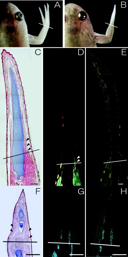 Figure 1. A Xenopus froglet limb regenerates a muscle-less spike after amputation. A,B: The same individual of Xenopus froglet before and after limb regeneration. Amputation of a forelimb at wrist level (A) gives rise to a spike (B). CâH: Histological and immunohistochemical analyses of muscle formation in Xenopus limb regeneration. C: A section of the spike was stained with eosin, Mayer's hematoxylin solution, and Alcian blue. Note that no muscletissue can be observed in the spike, except in the most proximal region (arrowheads). D: Antiâmyosin heavy chain immunoreactivity (fluorescein isothiocyanate [FITC] in green) was detectable in mature muscle in the stump and the most proximal region of the spike (indicated by white arrowheads). E: Pax7-positive cells (in green) were dotted in muscletissue of the stump, but no signal can be seen in the spike (see also Figs. 2E, 4A). FâH: Sections of a regenerate after amputation at the ankle level of a stage 52 hindlimb bud. F: A histological section that shows muscle fibers (arrowheads) and cartilage. G,H: Immunostaining with MF20 (G) and anti-Pax7 (H) antibodies (FITC in blueâgreen). MF20-positive mature muscle cells (G) and Pax7-positive muscle precursor cells (H) were detectable in the regenerate as well as in the proximal stump. Lines indicate the estimated amputation sites. Scale bars = 400 μm in CâH.