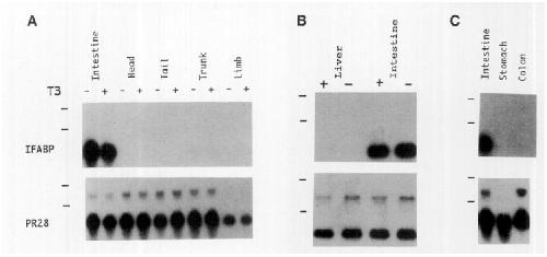 FIG. 3. NQrthern blot analyses show the tissue-specific. expression of IF ABP mRN A in the Xenopus sma\l intestine. T<Jtal RNA was isolated