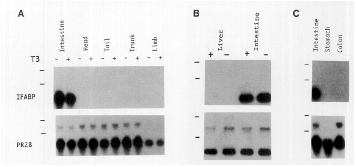 positions of 18S and 28S rRNA. (A) Regions and tissues dissected from premetamorphic tadpoles indicate that the IF ABP gene is expressed only