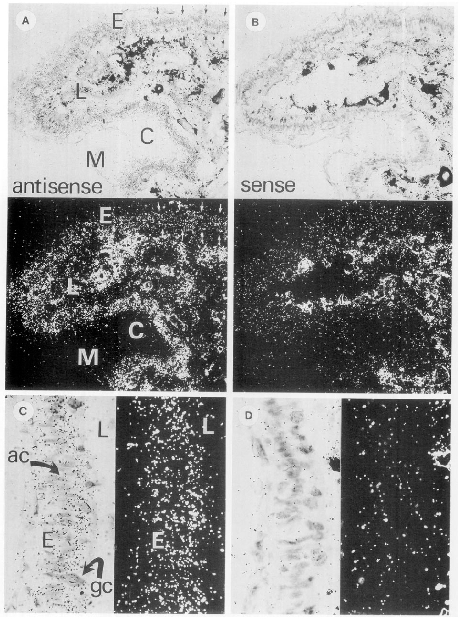 magnification (6.30><), IFABP mRNA (C) is clearly associated with the more abundant absorptive columnar epithelial cells (ac) and less so with