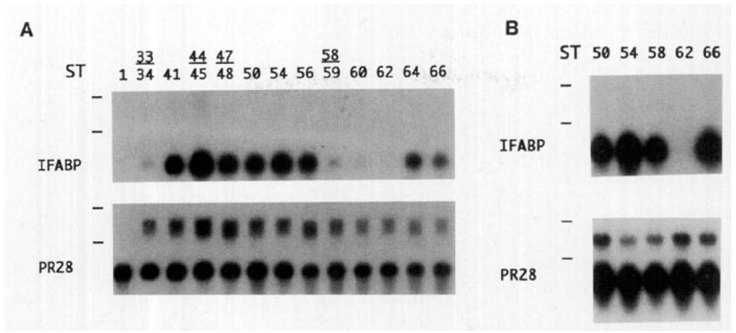 IFABP mRNA is down-regulated in stages 58 to 62 tadpoles undergoing metamorphosis. While the up-regulation of IFABP mRNA is also