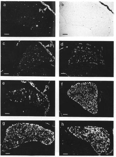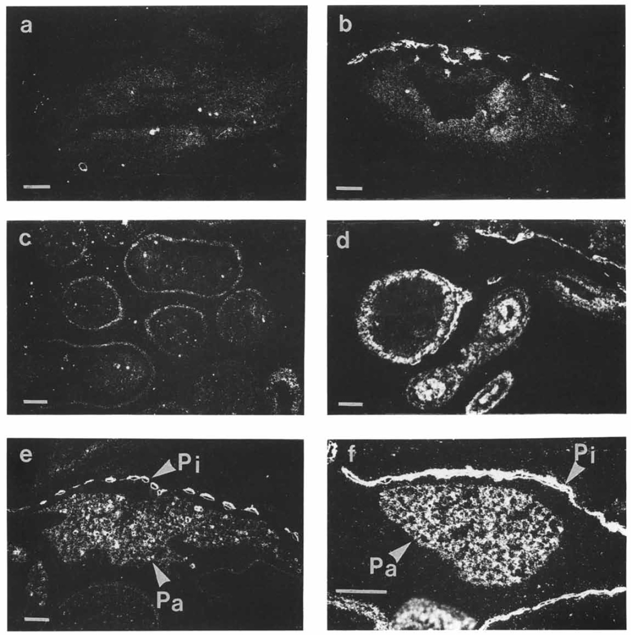 B1 cDNA (Wahli et al., 1979). Only the dark-field imaging with the antisense probe (a,c-f) is shown since the sense probe gave a negative signal