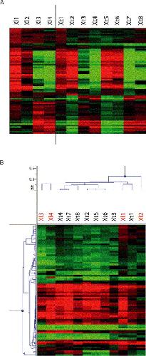 Fig. 2. The X. tropicalis oligonucleotide microarray also works using RNA from X. laevis. (A) Four X. laevis hybridisations are shown with eight X. tropicalis hybridisations for comparison. As with the X. tropicalis experiments each of the four X. laevis hybridisation is a biological replicate and dye swops were carried out giving 2 hybridisations with each combination of dyes. (B) Cluster analysis of the hybridisations from both species shows that the X. laevis hybridisations (marked in red) are often more similar to a X. tropicalis hybridisation than to another X. laevis hybridisation. For example X. laevis hybridisations 3 and 4 (Xl3-4) are most closely related to each other but are more similar to the X. tropicalis hybridisations (Xt 2–8) than the other two X. laevis hybridisations (Xl1 and 2).